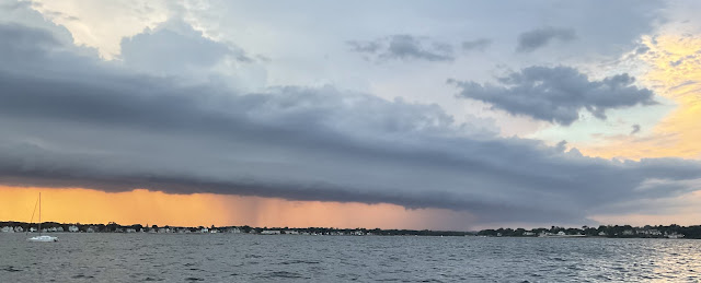 And then three sail days. The first was with the Old Salts on Wednesday. An experiment with the timing. Instead of convening at noon for lunch before sailing, we met at three pm for sailing before dinner. This made for a much more relaxed dining experience, for me because the long lunches cut into the sailing time which gives me agita. Also, the winds almost always comes up stronger as the afternoon progresses, promising sailing instead of drifting. Nineteen people showed up including eight passengers plus me on ILENE, and the rest on Dave’s “Lady Cat” and on a Club boat. My group were Mike and Helen, Clare and Ginny, Audrey and Kathy and, Phil and Louise — all repeat sailors. And the dinner after was jolly and served in the Continental manner (the only way they do it at the Harlem, i.e., very slowly) but no one was in a hurry. But the experiment was a failure, weather wise. An inversion of nature caused the wind to be lighter in the 3-6 time frame than what God had provided in the early afternoon. Go figure. So it was slow but all had a good time.